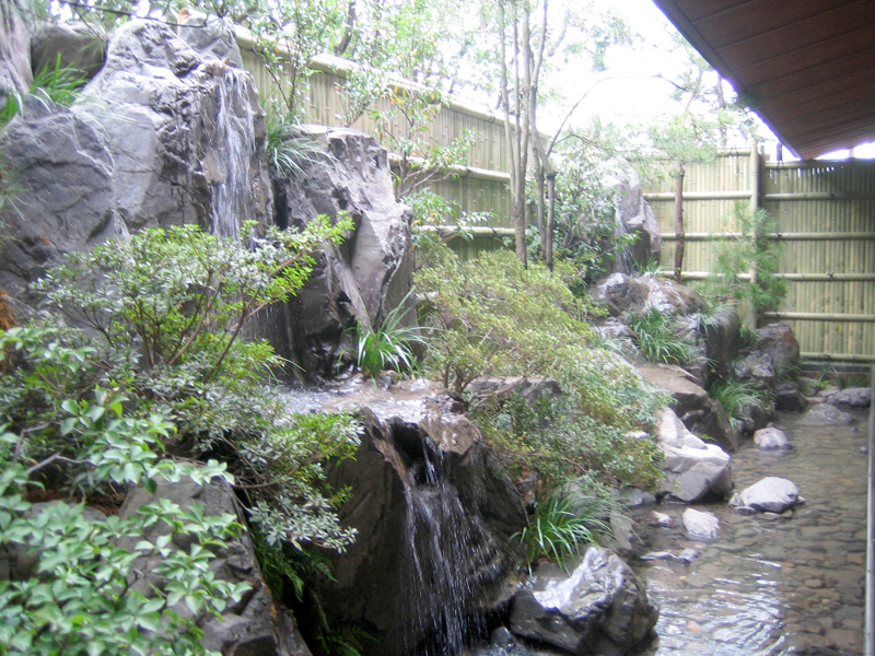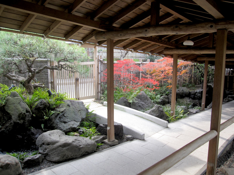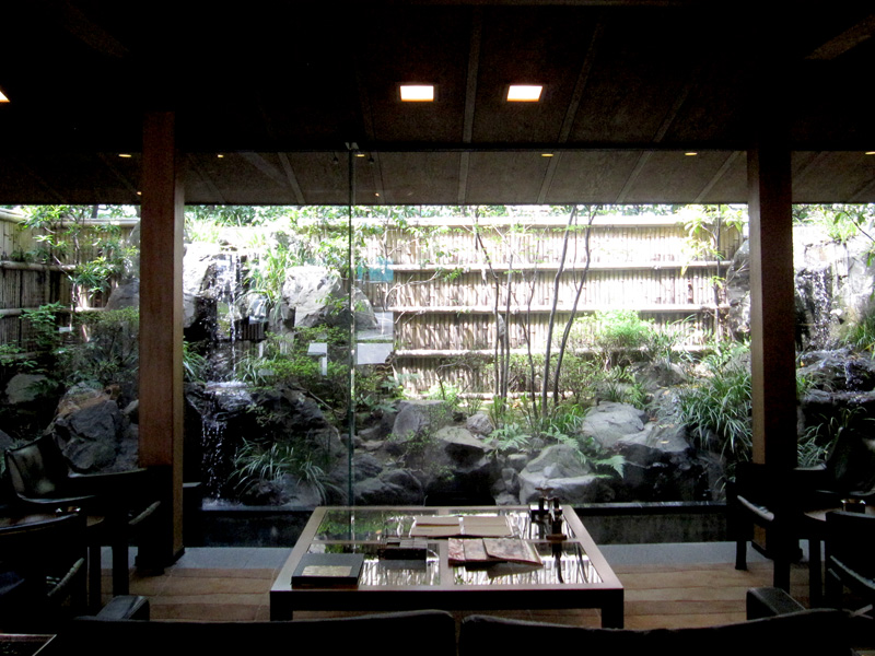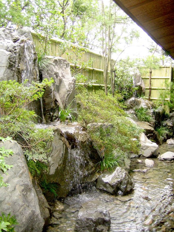 奥行2.5mの狭い敷地に、高低差3m雄滝・雌滝が流れ落ちる豪壮な水景が魅力の庭。