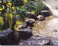 ほんものの自然は時間がつくりだしますが、造園家はその一瞬の風景を切り取って、眼前に再現しようとします。別べつの場所で時を重ねてきた素材を集め、まったく新しい必然性をつくりだします。しかし、巨大な滝石組みなど、大胆な発想を展開しても、最終的に安定した空間が生まれなければ、景としては成りたちません。数百年も前からそこにあったかのような姿に構成するには、自然の摂理に目を凝らし、数十トンの石のわずか1センチの位置にこだわり、ひたすら感性を磨きつづけるしかありません。技法や技巧は「隠し味」にすぎません。